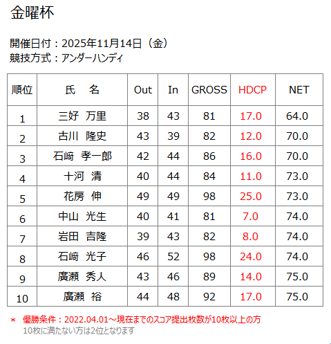 ホーム » コンペ・イベント » 2025年11月14日(金) 金曜杯