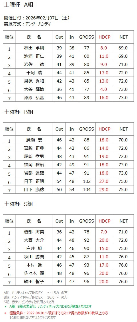 ホーム » コンペ・イベント » 2026年2月7日(土) 土曜杯