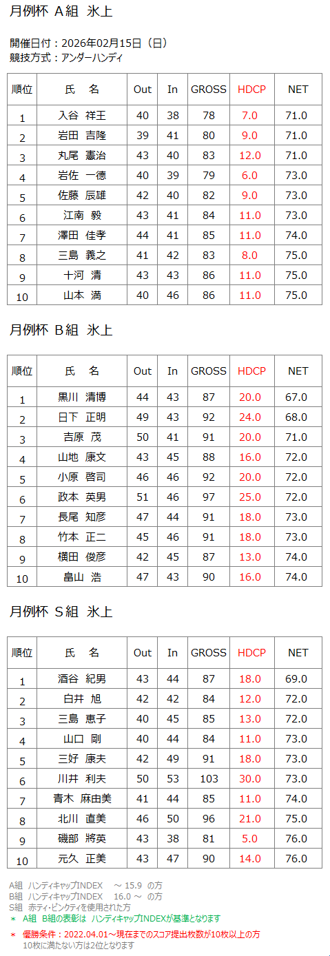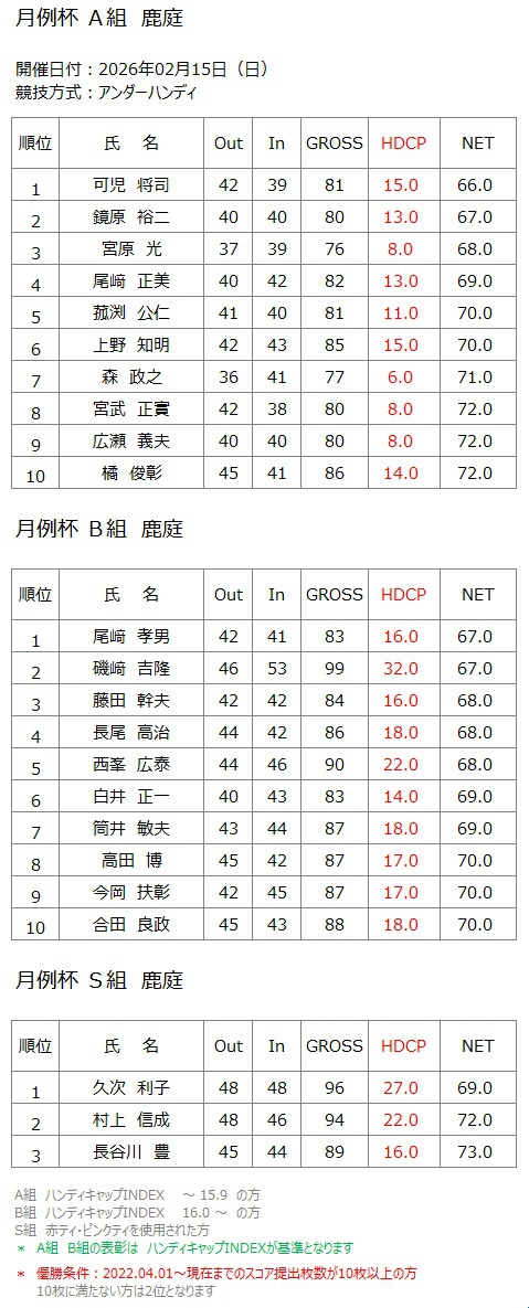 ホーム » コンペ・イベント » 2026年2月15日(日) 月例杯