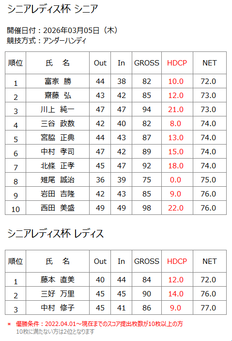 ホーム » コンペ・イベント » 2026年3月5日(木) シニアレディス杯