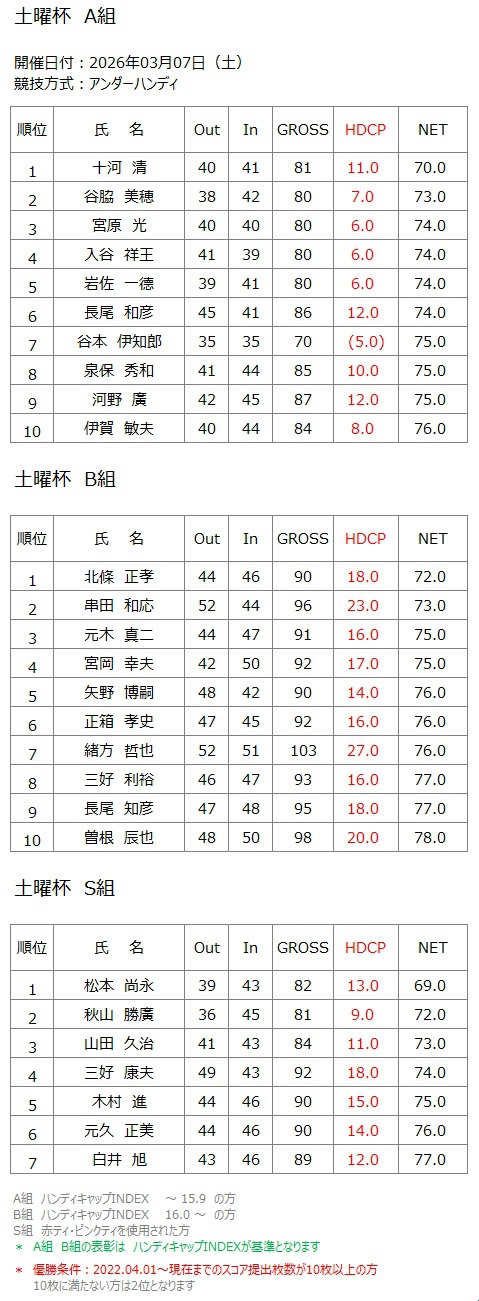 ホーム » コンペ・イベント » 2026年3月7日(土) 土曜杯