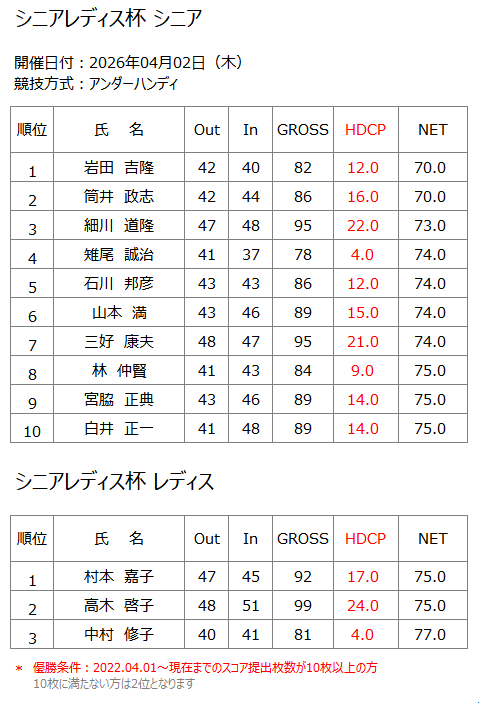 ホーム » コンペ・イベント » 2026年4月3日(木) シニアレディス杯