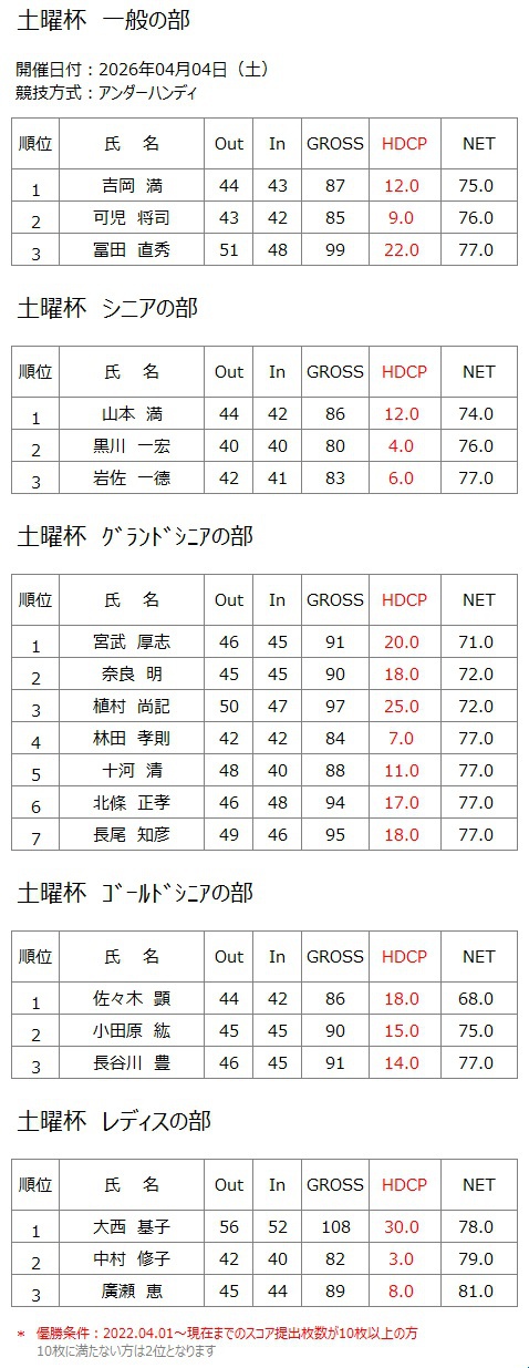 ホーム » コンペ・イベント » 2026年4月4日(土) 土曜杯